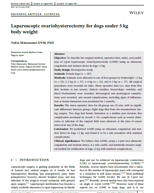 手術時間も早く、そして合併症も少なく、安全に手術を実施できますという結語で締めくくっておりますが、世界的に見ても日本国内で飼育されている犬の多くは小型犬です。それも5キログラム以下がほとんどのなかで、これまでこのような犬を対象にして調べられていなかったことでしたので、ジャーナル(雑誌)側からも一定の評価(今後はその雑誌のレフェリーになることにもなりました)をいただけました。